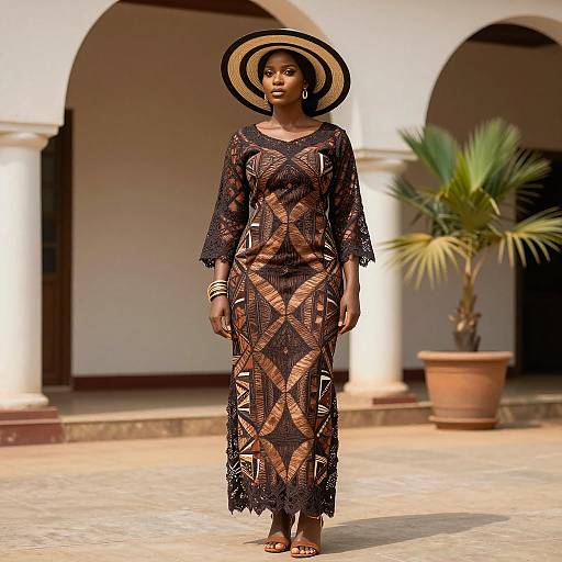 Flat illustration of a woman dressed in African tribal attire, in simple forms, minimalism, vibrant colors