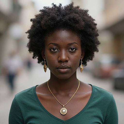 afro disco costume wig hair,jewelry, solo, 1girl, necklace, earrings, black hair, looking at viewer, curly hair, dark skin, lips, realistic, big hair, upper body, afro