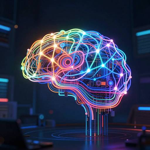 Immersive design featuring a robotic face intertwined with quantum circuit diagrams. The composition blends circuit patterns and glowing nodes overlaid on the face, creating an immersive, abstract fusion. The scene is illuminated with cyberpunk backlight, showcasing intricate details in a high-quality, ultra-detailed style. The artwork evokes a sense of digital transcendence, emphasizing the blend of humanity and digital innovation.