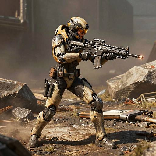 Helldivers 2 warrior holding a heavy blaster rifle, surrounded by alien creatures in a dense alien jungle, futuristic military gear with battle damage, moody lighting, cinematic composition