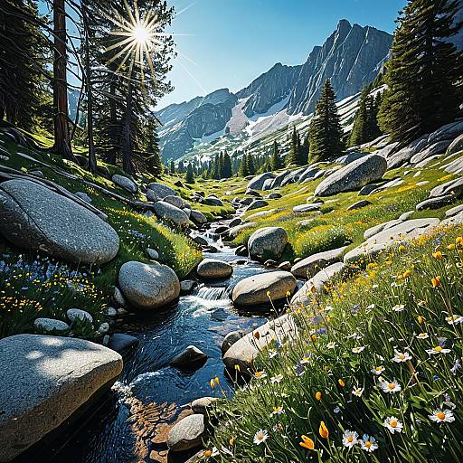 Wildflower Valley, mountainous terrain adorned with alpine flowers, overcast skies, midday light, STYLE:Ambient Occlusion Only, Soft shadow-based look