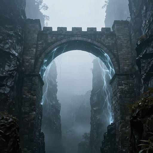 You are a traveler on a long journey through a mysterious fog-covered valley, encountering an ancient stone archway covered in vines, vivid detail including the damp smell of earth and the soft crunch of leaves underfoot, immersive and realistic
