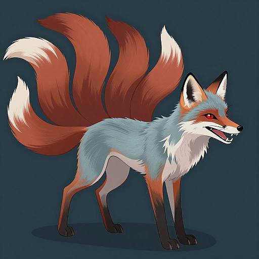 Digital illustration of a nine-tailed fox. Fox has pale blue-gray fur with red-tipped tails, black legs, and a white muzzle. Fox's mouth is open, showing sharp teeth. Fox's eyes are red. Background is dark teal. Artist's in vertical on the left. Fox's body is in a dynamic, side-stepping pose.