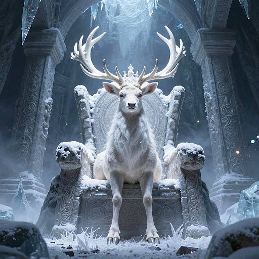 Anthropomorphic deer depicted as a king, wearing a cloak of leaves and a horned crown, with a serene look.