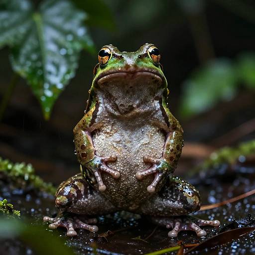3D Animation of a small green tree frog perched on a mossy branch, peering down at a watchful brown salamander reclining on emerald moss, immersed in a rain-drenched foliage with soft focus on the small green tree frog.