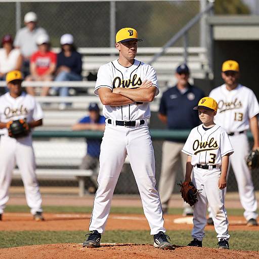 swf, SFW, joseph_joestar_young, baseball uniform, hat, sportswear, baseball mitt, blonde hair, pompadour, baseball bat, baseball cap, multiple girls, multiple boys, black hair