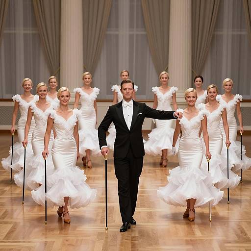 A large baroque ballroom with golden chandeliers, peacock feathers, and delicate lace, a beautiful woman with long red hair dancing tango in the center, powerful and graceful, cinematic lighting, high detail, dark magic ambiance, 8k.