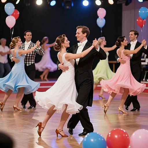 Photorealistic scene of a couple dancing, in a ballroom in Vienna, from a corner of the room, cinematic, soft ambient light, shot with ultra-wide angle, 50mm lens.