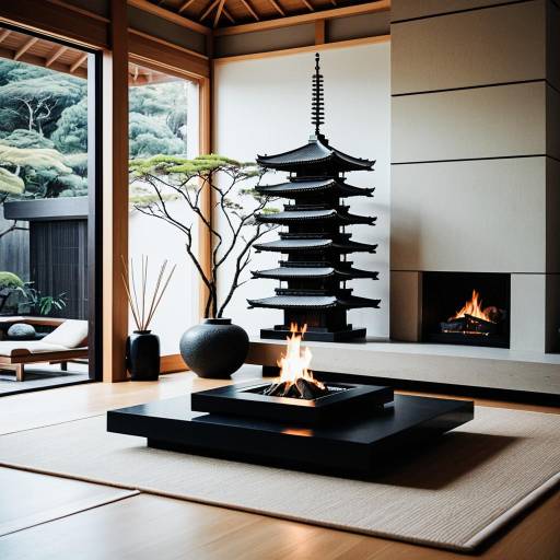 luxurious glass house, modern Japanese living room, minimalist bamboo decor, high-tech devices, fireplace, coherent composition, architecturally accurate, cozy interiors