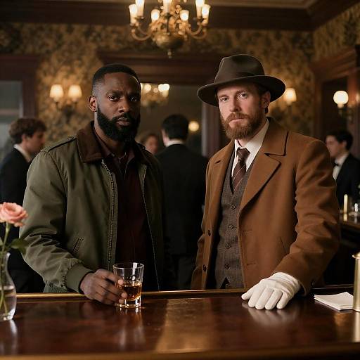 The pink champagne on ice, dapper gentleman in an upscale lounge, frosted bottle, intimate setting with leather armchairs and soft lighting, opulence and indulgence, realistic, 8K, ray tracing.