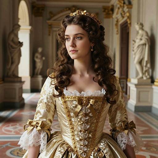 Regal depiction of an art princess adorned with velvet brocade dress, painted with Rococo flair, set against a grand neoclassical veranda