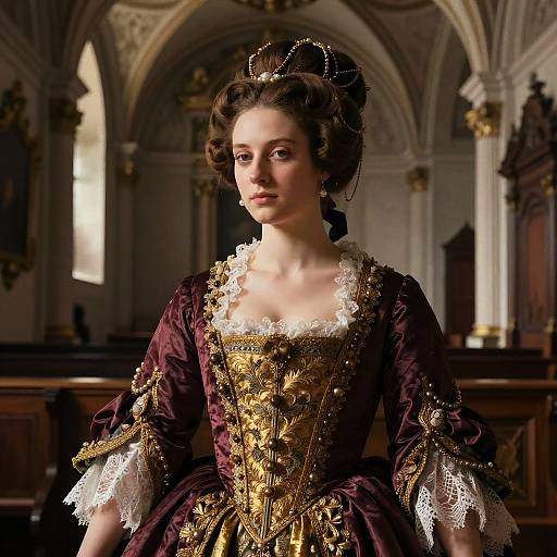 A detailed portrait of a woman in an elaborate 17th century baroque style dress with intricate lace and embroidery, featuring rich cream and gold colors. The scene is lit with soft and dramatic lighting that emphasizes the textures and facial features. She wears a braided bun with gold filigree clips, set against a historical hall with marble columns and patterned wallpaper. The image resembles a highly detailed and realistic oil painting, with a warm and sophisticated atmosphere.