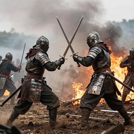 Digital artwork of a showdown between a red-skinned demon with large horns and a muscular man with short hair, facing each other. Bright red-orange background. A glowing, circular artifact with runes on the right side. Intense expressions.