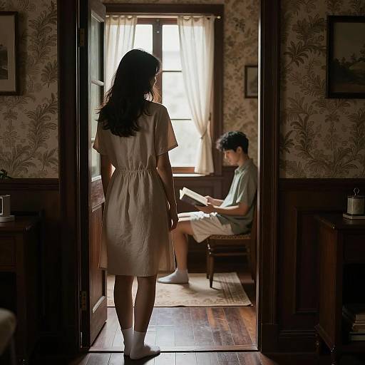 Woman with curly brown hair, wearing a beige lace bra, stands in a doorway. Her right hand holds the door frame. Background has framed pictures on a patterned wall. Light brown wood frame surrounds the glass door.