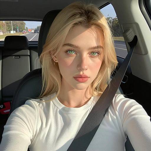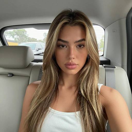 a stylish woman sitting inside a car during golden hour, wearing a beige long-sleeve blouse and black leather shorts, soft warm lighting illuminating her face, natural background seen through the window, elegant and cinematic mood, warm color tone with beige and brown hues, soft shadows enhancing depth