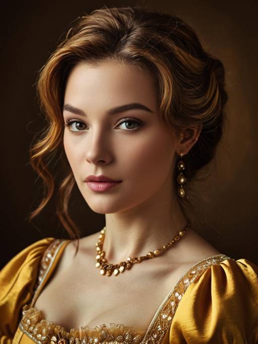 upper body, 1girl, solo, sophisticated woman with chestnut hair in a bun and dark eyes, yellow dress, belt, jewelry, earrings, delicate, feminine, fashionable, gentle expression, intricate, detailed, vibrant colors, poised, head slightly tilted, arms behind back, gemstone ring, white background