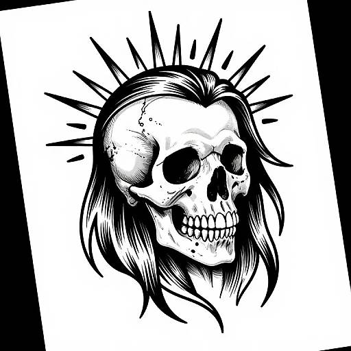 skull, black skull, skull, no humans, sun, profile, from side, solo, male focus, leaf, rose, portrait, 1boy, traditional media, sunburst, black skull