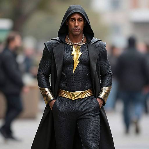 black adam final costume,1boy,male focus,solo,standing,full body,armor,belt,window,bodysuit