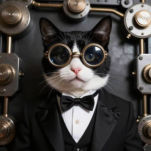 magnificent black and white tuxedo cat with dazzling amber eyes confidently walking toward the viewer across classic sunlit conservatory filled with lush greenery and wrought iron furniture, lit by warm, filtered light through stained glass panels. Natural textures of fur, fabric, and wood emphasized; inviting and homey atmosphere; shallow depth of field; crisp whiskers; soft vignetting; balanced composition; subtle film grain; realistic color rendering; gentle contrast; fine detail throughout.