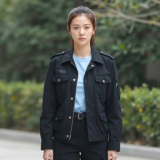 all black birthday outfit, photograph of a young woman, dark brown hair in a low bun, wearing a black long-sleeve top and black leather pants, standing in front of a dark background with lit candles in candelabras, soft lighting, elegant and moody atmosphere, realistic style, portrait orientation, model looking directly at the camera, subtle makeup, neutral expression