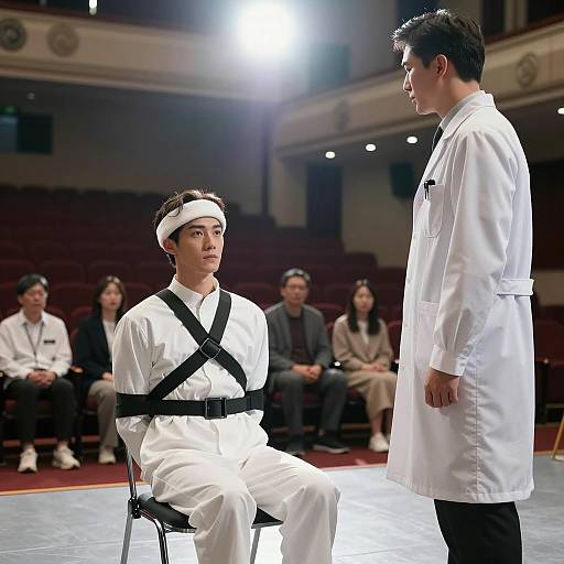 African American man with short blonde hair, intense gaze, wearing white shirt, seated in metallic chair with circular cutouts. Two blue-jacketed figures stand behind him. Metal bars in background.