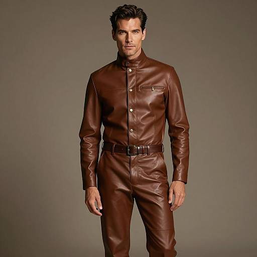 confident young man, wavy brown hair, muscular build, leather shorts outfit, edgy chic style, fitted white tank, cropped leather jacket, leather shorts, ankle boots, urban streetwear, beige with warm undertones studio background