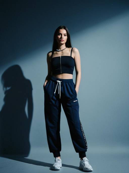 Woman, streetwear, black cropped tube top with central zipper, elastic hem with brand label detail, matching black joggers with high waist, drawstring, relaxed fit, silver chain necklace, minimal makeup, white studio background.
