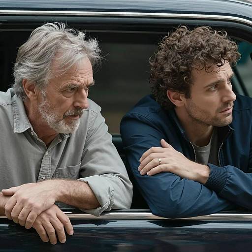 Man with short dark hair and light skin, wearing a beige jacket with brown sleeves, drives a black car at night. His intense gaze looks to the right. Car window and windshield wipers are visible. Dark background with a single red light in the distance.