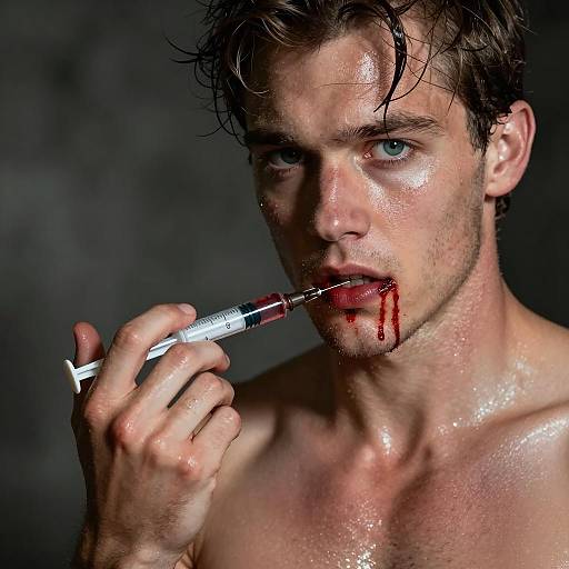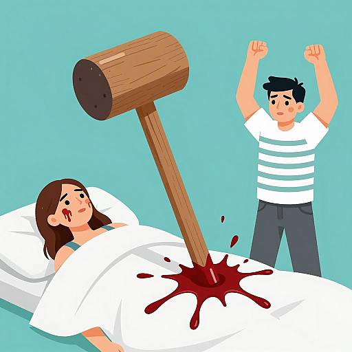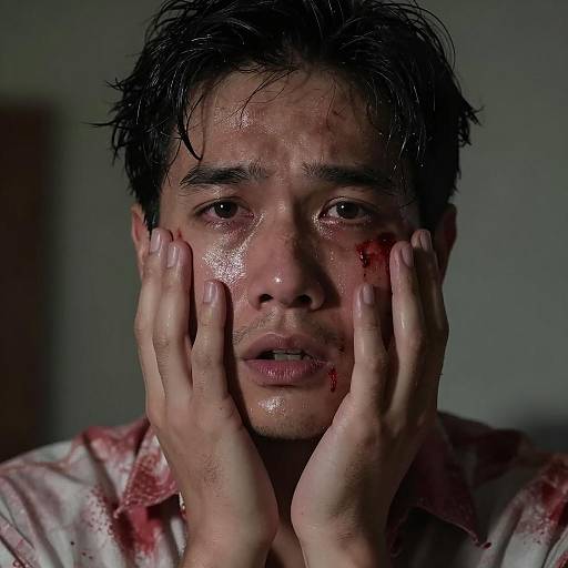 a woman with long red hair, wearing a gray tank top and white underwear, sitting on a bloodstained bed. She is covering her face with her hands, her body positioned sideways. Blood splatters are on her legs, the wall, and the bed. Pillows are on the bed. A shelf with small objects is above her. The wall has a stain and a picture. The room is dimly lit.