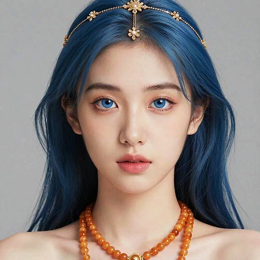 blue mullet wig hair,1girl, solo, jewelry, necklace, blue eyes, blue hair, looking at viewer, earrings, realistic, long hair, blurry, blurry background, upper body, multicolored hair, wavy hair, closed mouth, hair between eyes