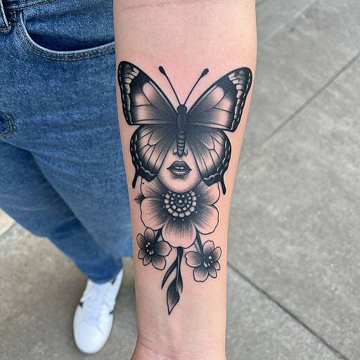 An epic high-quality tattoo design of a butterfly, delicate wings and floral patterns, whimsical doodle art, dynamic and artistic, vibrant colors, visually striking.