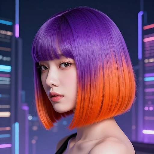Virtual hair color experiment featuring bold electric blues and purples, glowing softly under ultraviolet light, futuristic fashion model with sleek modern outfit, surrounded by floating digital data streams, vibrant and immersive cybernetic atmosphere.
