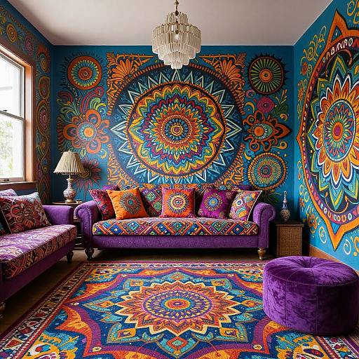 bohemian kitchen design featuring vibrant textiles, mismatched chairs around a large wooden table, macrame wall hangings, lush greenery, exposed brick walls, layered textures and cozy atmosphere