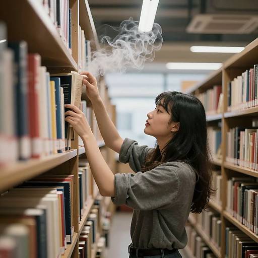 Sunlit shelves flank a quiet aisle as seven birds glide gracefully between rows of ancient tomes, casting soft shadows on the carpeted floor beneath.