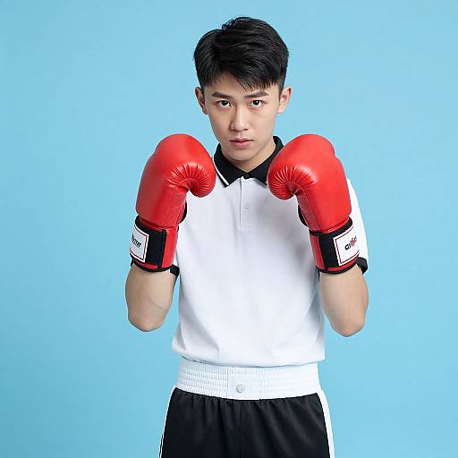 Patrick Nagel style image of a boxer wearing boxing gloves, throwing punch using only black, white, red, orange, and yellow. Bold, minimalist design with a focus on sharp lines and contrasting colors, evoking Nagel’s signature style.