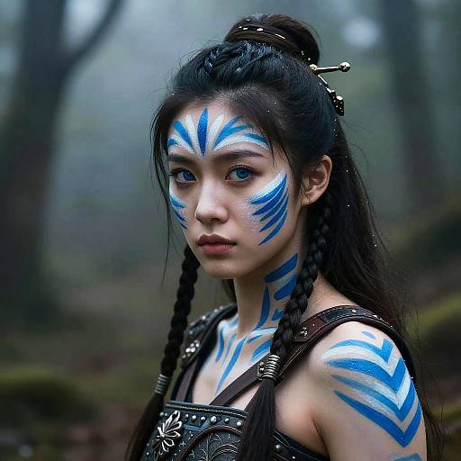 a strong female warrior, age 35 with a braided hairstyle, portrayed in a heroic style. The photo has an epic fantasy style with intense lighting and battle scenery for a sharp and focused look.