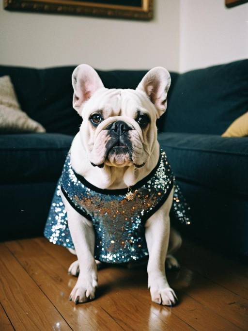 dog, bulldog, realistic, no humans, animal focus, flower, blurry, blurry background, animal, realistic, collar, brown eyes, depth of field, solo, looking at viewer, outdoors, white flower