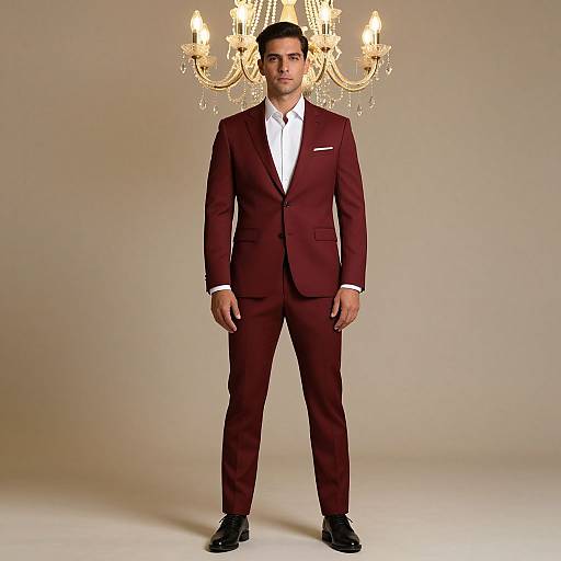 Black male model in his late 20s wearing a fitted burgundy suit with a crisp white shirt and a matching tie. Full body shot on a white background, capturing confidence and allure. Hyper-detailed, color-graded, shot with 24mm lens, cinematic lighting, natural lighting, Kodak film aesthetic, professional photograph, ultra-realistic, VR-ready