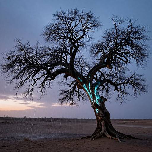 Fire painting of a burning tree against a glowing sunset, featuring intense heat effects and swirling sparks in a magical atmosphere.