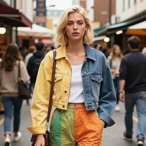 Platinum blonde buzz haircut on a confident young woman, urban street style, graffiti walls in the background, casual trendy clothing, natural makeup