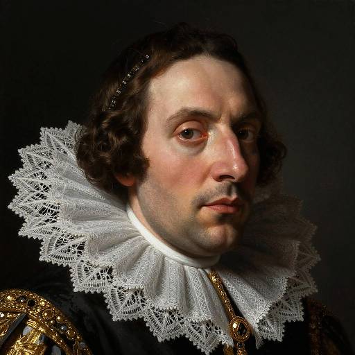 Close-up portrait of a noble man in a looking downward position, dressed in Renaissance doublet with gold embroidery, intricate details in his expression, rendered in a painterly brushstrokes