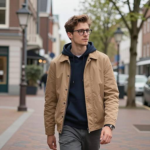 Photo-shoot, trend-savvy office worker, medium-length swept back, slender frame, semi formal outfit, casual suit with sneakers, clean minimalist style, open terrace with city view background