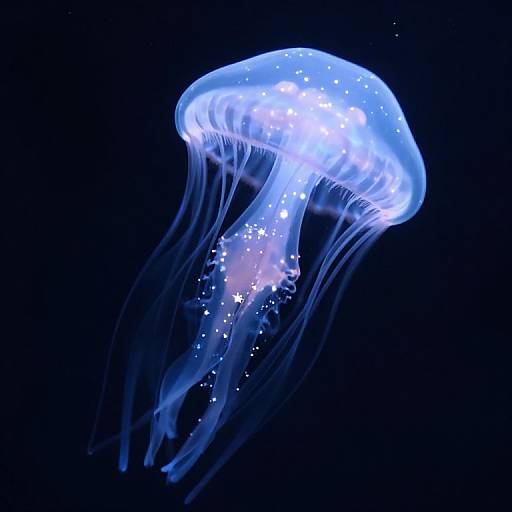 A luminous, crystalline fish floats ethereally above the ocean, its translucent body shimmering with stardust as it glides through the air under the mesmerizing glow of an aurora-lit sky, with a warm, glowing lighthouse casting a serene beam in the distance.