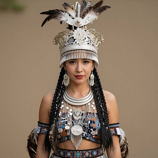 Portrait of a pentaculo performer in full regalia, detailed mask with symbolic patterns, textured fabric costume with bells and fringes, intense facial expression visible beneath mask, soft directional light highlighting craftsmanship, artistic focus on cultural identity and tradition