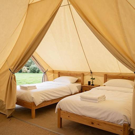 Bell tent stands gracefully in a serene outdoor setting, featuring a cozy interior with a plush sofa, two armchairs, and a small wooden table adorned with candles, all nestled beneath lush green trees and framed by a rustic wooden fence.