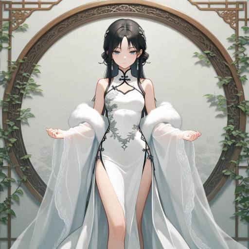 sexy cosplay outfit Jiao fitted silk cheongsam with a high side slit, delicate floral patterns, and long flowing hair with ornamental hairpins
