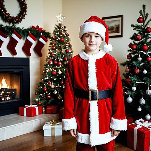 christmas festive outfit, 1boy, hat, solo, male focus, santa hat, santa costume, christmas, christmas tree, red gloves, belt, gloves, blurry, blurry background, pants, looking at viewer, fur trim, red capelet, red headwear, standing, jacket, scarf