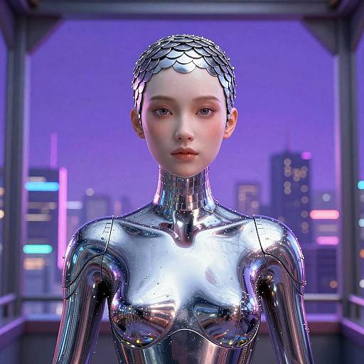 Chrome chest plate gleaming under dramatic lighting, futuristic armor design with intricate engravings, high-tech reflections, worn by a cybernetic warrior in a dystopian cityscape