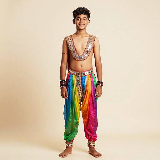 Full body-shot by vibrant festival photography, cheerful teenage boy, short curly hair, slim build, (Navratri, Chaniya Choli:1.3), colorful churidar with mirror work, multiple bracelets, plain cream studio background