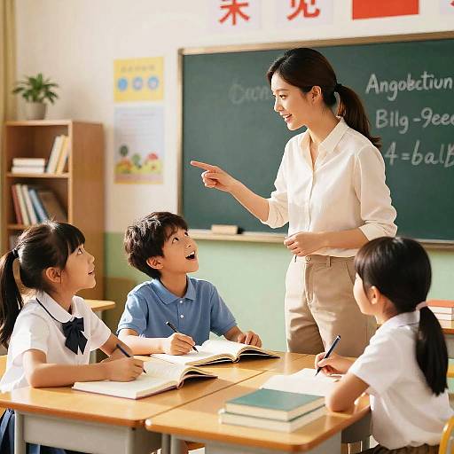 a group of six adults engaged in a discussion around a classroom setting, diverse casual clothing, lively interaction, modern classroom with whiteboard and chalkboard, bright natural light illuminating the scene, educational atmosphere
